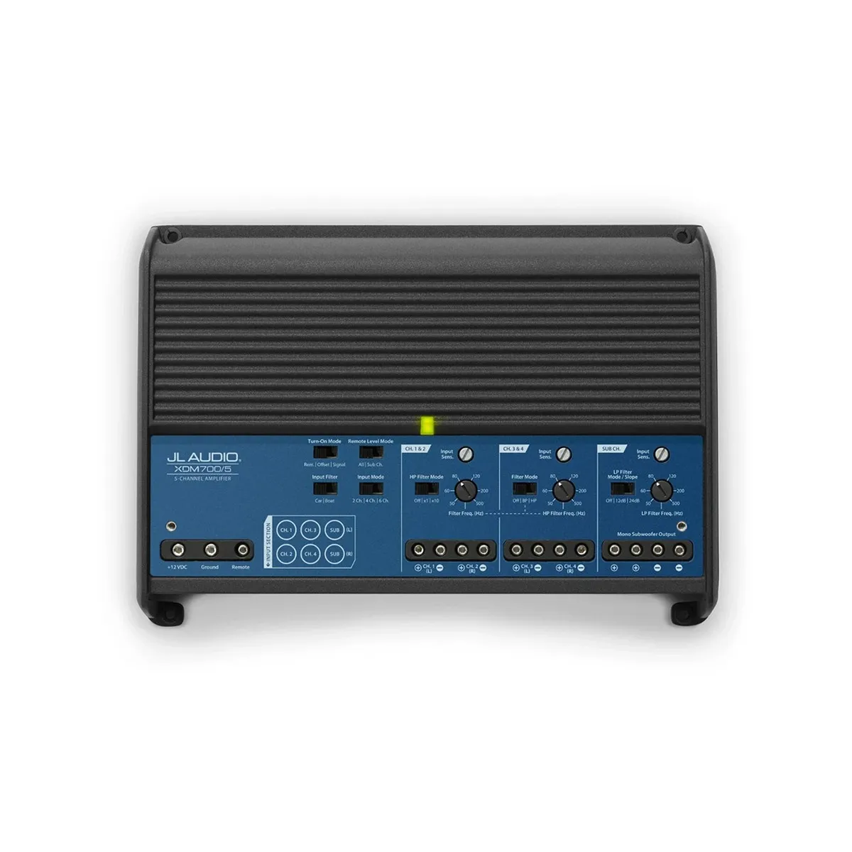 Amplificador de 5 canales, 4 canales de rango completo y 1 canal de subwoofer. Canales de rango completo: 75w RMS por canal a 4 ohms, 100w RMS por canal a 2 ohms, 200w RMS en puente a 4 ohm. Canal de Subwoofer: 300w RMS a 2 ohm, 150w RMS a 4 ohm, linea marina-automotriz
